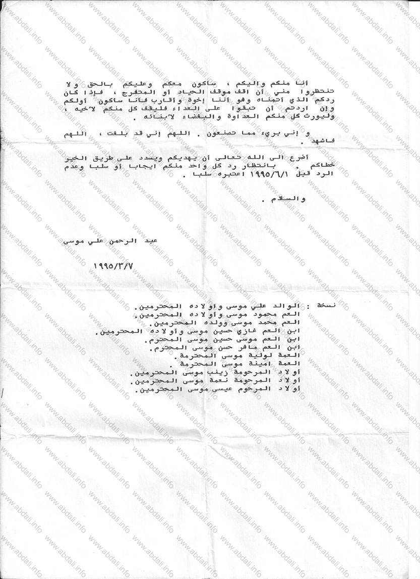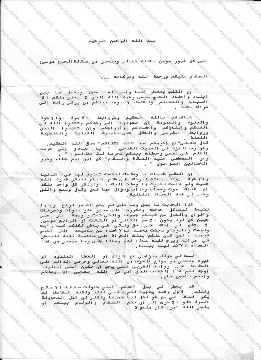بعد شرائي لأرض (أحمد عودة) في رأس وادي القلمون وإنقسام الورثة بين مؤيد ومعارض، وفي بداية التسعينات وبعد المشاكل الكبيرة التي حصلت بين ورثة (الحاج موسى) قمت بإرسال كتاب أحض فيه الورثة على نبذ الخلافات وتوريث الأبناء الحب والإخوّة وليس العداوة والبغضاء وطلبت إجابات منهم وللأسف لم يراجعني شرقاً ولا غرباً إلا شخص واحد هو والدي حيث حضر إلى عمان وإستفسر عن الموضوع أما البقية فمنهم من سخر ومنهم من إستهزأ ومنهم من إلتزم الصمت ومع ذلك واصلت لمحاولة إصلاح ذات البين، وفي يوم من الأيام تركت عملي وأهل بيتي وسافرت إلى الضفة لأحل مشكلة التراكتور الخاص بوالدي وحاولت أن أجيء على نفسي وعلى والدي ولغاية الآن لم يدفع الحكم بالتعويض وعدت من الضفة وللأسف الشديد لم أحظى بأي نوع من أنواع الإحترام أو المعاملة الإنسانية اللائقة وكل هذه المحاولات قوبلت بالجحود والنكران وكأنني أنا المستفيد من إرث (الحاج موسى) وآخر محاولاتي كانت في العام 2009م عندما حاولت أن أحل مشاكل الطرق بين ورثة (الحاج موسى) والنتيجة سب وتنكر لــ(الحاج موسى) شخصياً أمامي وأمام الناس يقومون بعكس الحقيقة.