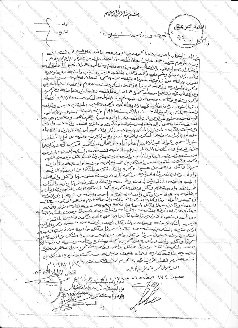 حتى لا نسمع أي مزاودة من أحد فأنا من طالبه ورثة البنات بحقه في إرث جدي ومن يدعي أنه عنده تنازل إذا كان هذا التنازل لم يسجل لدى المحاكم عن الحصة إلارثية أي إدعاء خارج هذا النطاق فهو باطل ومن يريد الإلتفاف على حكم الشرع فهو حر بإمكانك أن تخدع الناس لكنك لا تستطيع خداع رب الناس فاتقوا الله ويعلّمكم الله.